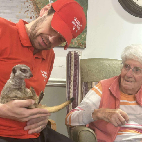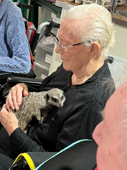 Our residents embraced the opportunity to interact with the animals, and their reactions were a joy to witness. Whether gently stroking a skunk, holding a meerkat close, or even daring to let a millipede crawl over their hand, each encounter was a personal moment of discovery. The experience was especially valuable for residents living with dementia, offering multi-sensory stimulation through touch, sound, and smell.